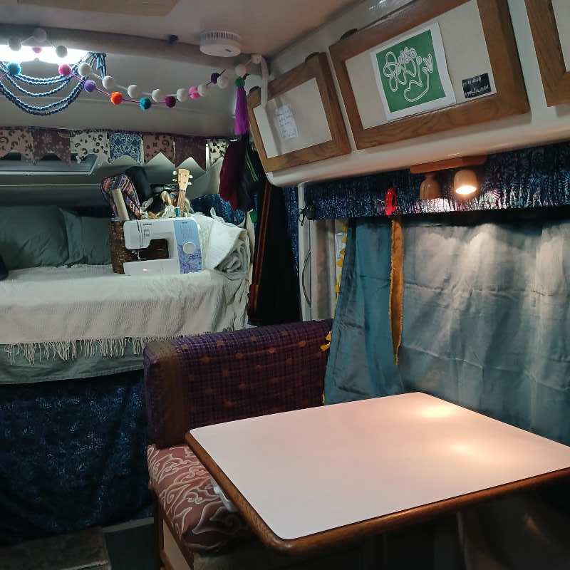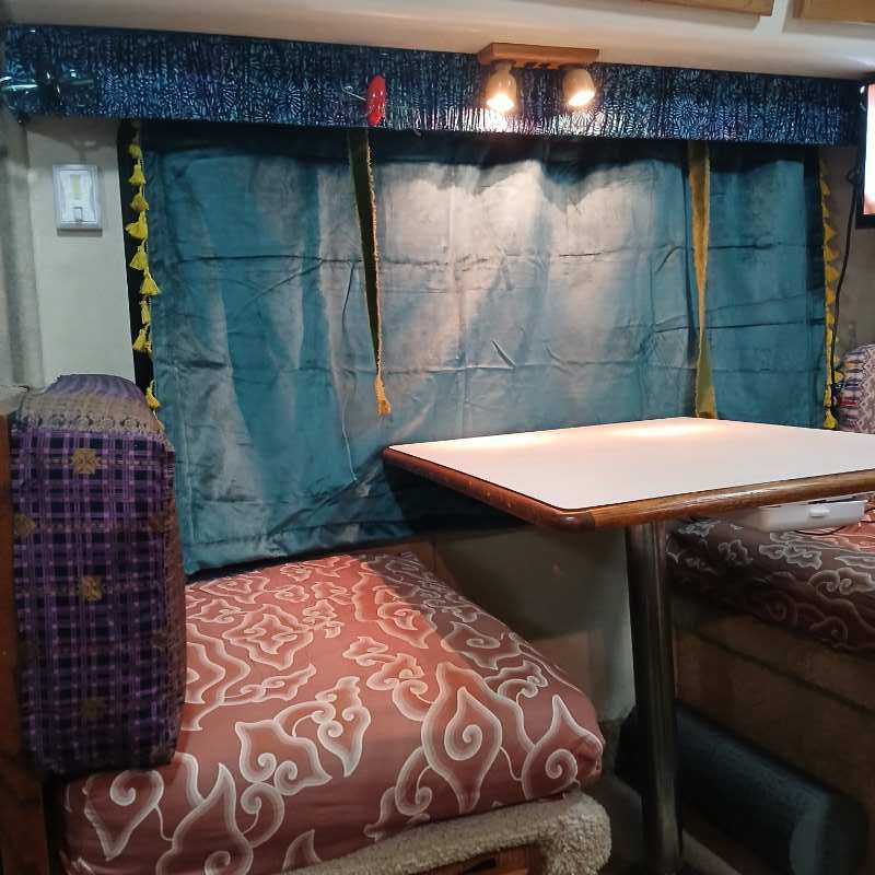 I have completed this project and am posting a few photos. I like the new curtains because I tie them up from the bottom. I used a velvet and padded it with quilted cotton. I can already feel the new warmth in the camper. I used the same clips and main bar from the blinds as the curtain rod so I didn't have to mount anything new.