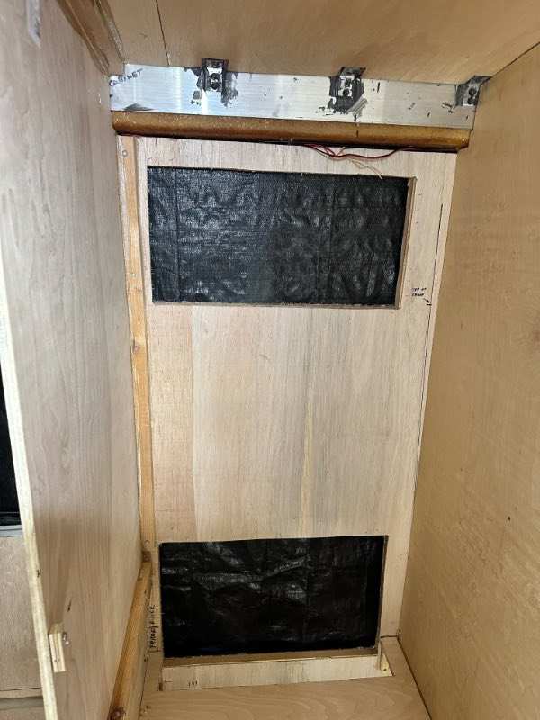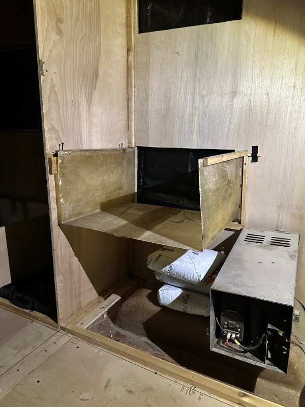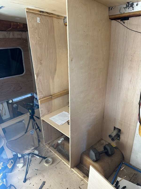 Thanks for checking in. Definitely slowed down for summer, travel and camping. In two months time, I've only built the fridge base piece, and just yesterday built a cardboard template for the other side wall that will define the space. Sunday, I'll lay that on more baltic birch ply and cut it, then the fiddly part of filing here and there to a friction fit. If I get that done early, I'll screw and glue it in place. Because of the weight of the fridge, this strong structure will be the hardest part of the left (US driver's) side cabinets. And I'll be glad to be done with it. The rest will simply be storage, and who cares if storage cabinets are off by 1/4" here and 1/8" here due to the walls tapering and the arched ceiling, etc. To finish the fridge enclosure, there is still a top piece as well as a false back wall to do. This false wall ensures the heat goes up and out the upper vent. If you've never seen it, this enclosure is pretty complex. The floor also has to have a sloped section against the wall to allow any condensation dripping to go out the lower vent. I've already given up any hope of using it this season, but haven't lost enthusiasm for what is going to be a pretty cool setup when I'm done. I'll post pics on Sunday.