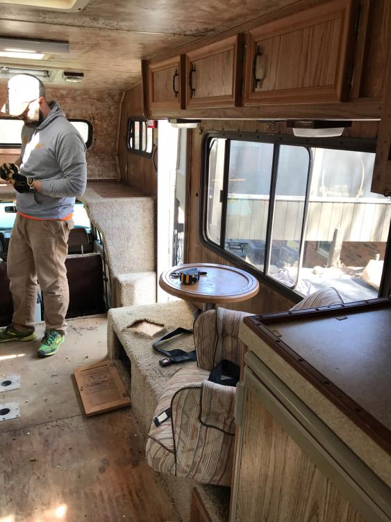 I recently purchased an 86 dolphin. We are renovating it currently. Our model has the two club chairs and small table in lieu of a dinette. Has anyone done this before? Any reason not too? To me a dinette seems more practice than the club chairs. Here is a picture of what I'm dealing with lol. I have both the chairs and the base box out now. Everything is currently stripped to the plywood. Any input is appreciated. Thanks!