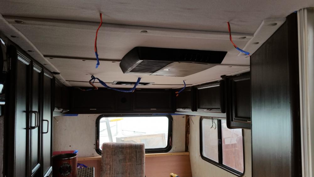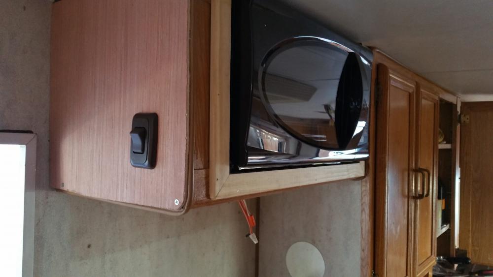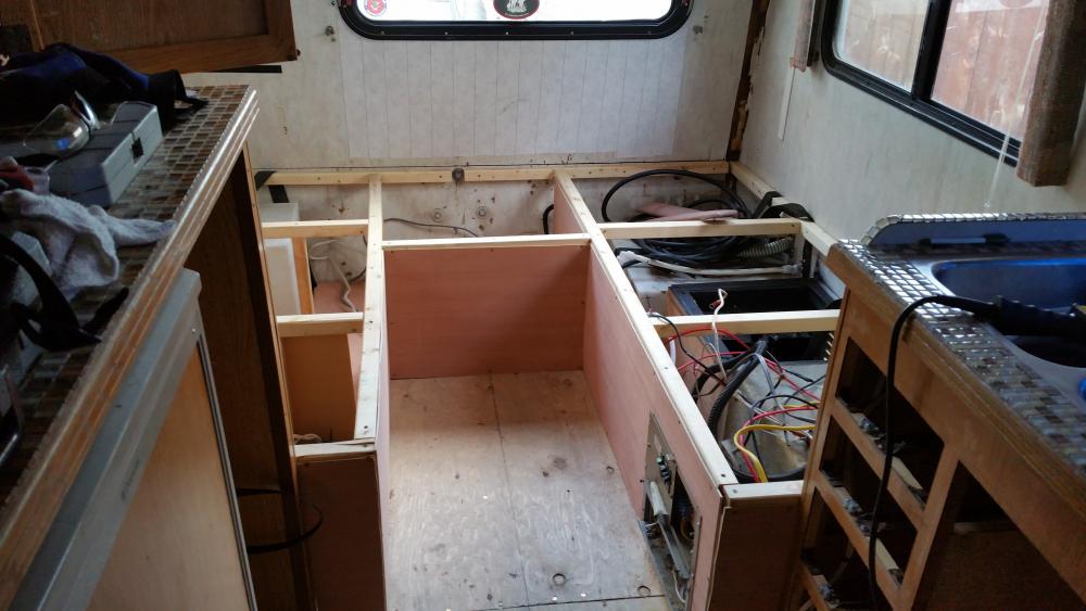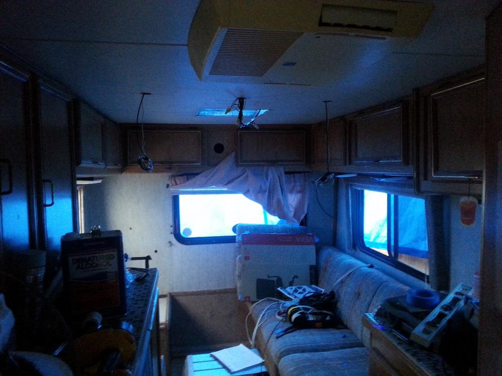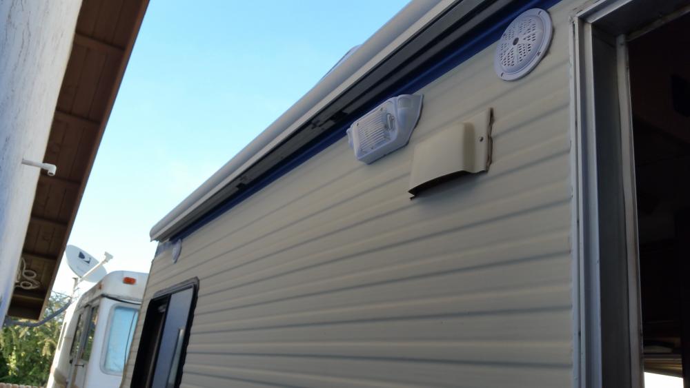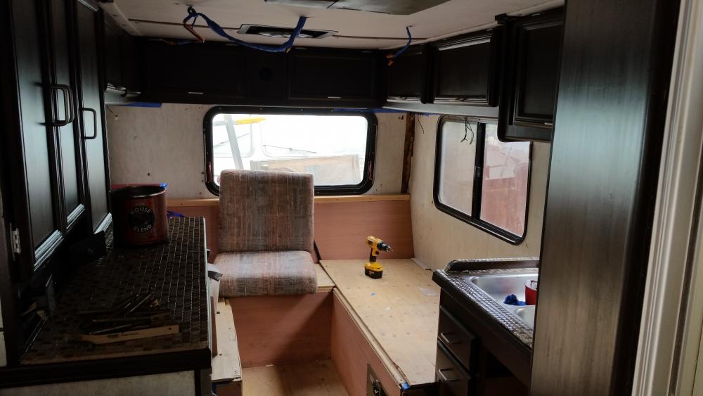 Hey All, I've been really, really happy to have found this forum. I haven't asked a lot of questions here as the search feature seems to answer every one I've had! I wanted to share my progress... First of all, when I bought this, I didn't want another project. Unfortunately, it's become one. On it's face, the camper was in good condition when I bought it. I knew that I was going to want to resurface the cabinets and put in a new floor. The prior owner had only had it a couple of months. He'd bought it for the rear dinette setup - but really wanted a u-shape in the back. He ended up finding what he wanted and put this one up for sale. When I went to buy this one, he had two sitting side-by-side. I guess what I'm trying to get at is that the prior owner couldn't have known what lurked below - neither did I. When I got it home, the very first thing that happened was that the roof leaked - badly. It destroyed the ceiling inside of the camper. I had inspected the roof when I went to buy the camper. It had a lot of sealant on it, but I didn't see any water damage inside. I figured that I could get around to fixing that at my leisure. That ended up turning into a 2 month job where I replaced all of the roof components with the exception of the AC. I scraped, sanded, cleaned, and eternabonded the roof a la Back East Don's posts. What a pain in the neck. I still need to get the coolseal up there, but I have been busy on the inside since I rendered it watertight. When I started to pull up the flooring, I found that there had been a lot of other water intrusion. That required a whole lot of dryrot removal and rebuilding. I decided that since I needed to rip everything out of the rear of the camper to fix the problems that I'd just build in a u-shaped dinette as it would be a better fit for my family. So - here are the photos. I love looking at photos of people's work. My wife calls it my "porn." BEFORE: As you can see, it looks pretty nice. The cabinets however had been slopped with polyurethane and needed fixing. The floor was peel and stick parquet - and I am not a fan of parquet. WORK IN PROGRESS: I didn't take any photos of the roof work. But, since I had all of the roof vents off it provided easy access for me to be able to run wires for updated electrical, lighting and AV stuff. You can see the wires hanging out of the ceiling. Then I found the rest of the problems on the floor. I found that the battery door on the driver's side and the propane door on the passenger side were the culprits of the leaking in addition to a roof leak that had run down the rear corner on the driver's side. Both of the side doors were poorly installed at the factory. An undetectable leak waiting to happen - and had been happening probably since the mid 90's. Upon discovery, the language may not have been safe for a sailor. Tearing the inside out was not what I had planned to do: After the dryrot removal I had to put in a new floor and built the bottom for the u-shape dinette. I gained a lot of extra storage here. I installed some outdoor speakers and motion sensing porch light: I also installed a microwave over the stove. The camper was wired for one over the sink, but that cabinet is very large and my wife wanted to keep it for kitchen stuff. Happy wife, happy life. The microwave was rewired and installed on the other side: I refinished the cabinets using Rustoleum's Cabinet Transformation product. It was A LOT of work. I am only marginally happy with the results. They look better than they did, but not as good as they should have with the amount of work that went into them. If I had it to do over again, I'd have just used my sprayer with a good paint. I'm also a little concerned with the durability of the product for RV use. I've also installed a headliner on the ceiling after repairing the damage from the leak. I've still got a lot of work to do, but I see the light at the end of the tunnel. I quit counting how much money I've spent as I think it would make me ill. My wife and I are dying to get it back out on the road. All of the help I've found here has gone a long way toward getting it finished, so thank you all!!