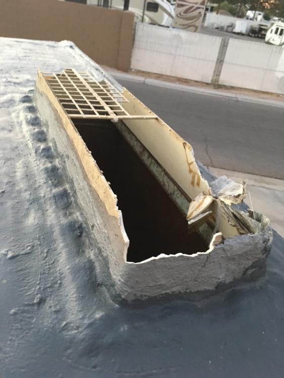11. Hi Folks, We're about 3,500 miles into our summer road-trip at the moment. 2 days ago we noticed that our refrigerator roof vent cover was missing, I got on the roof to have a look and it looks like the base is damaged too (see photos). Really not sure how this happened - we didn't hit anything that we can think of.. Anyway, I'm wondering how to go about fixing this? As mentioned, we are on the road so if a 100% fix is going to be a lot of effort is there something short term I could do? Could it be worth just taking it to a servicing shop? For reference, the vehicle is a 1991 Winnebago Warrior, the fridge is Norcold brand. and we are in Vegas currently (in case anyone can recommend a service tech). Thanks in advance! Nick