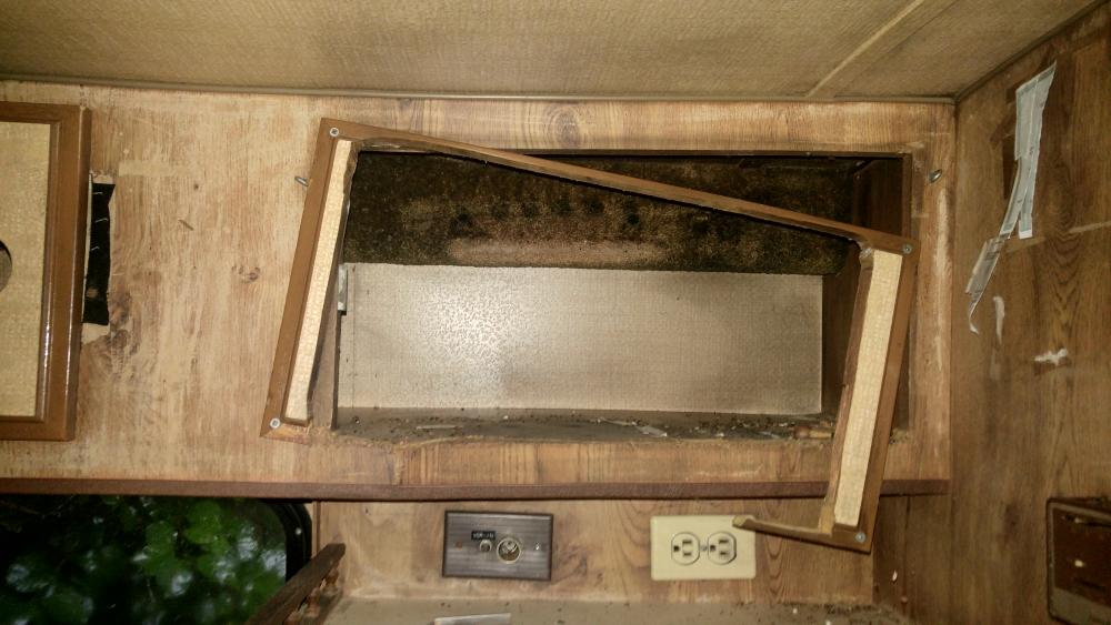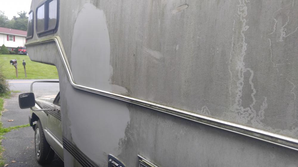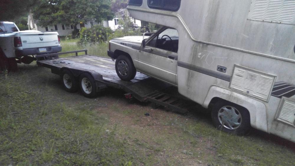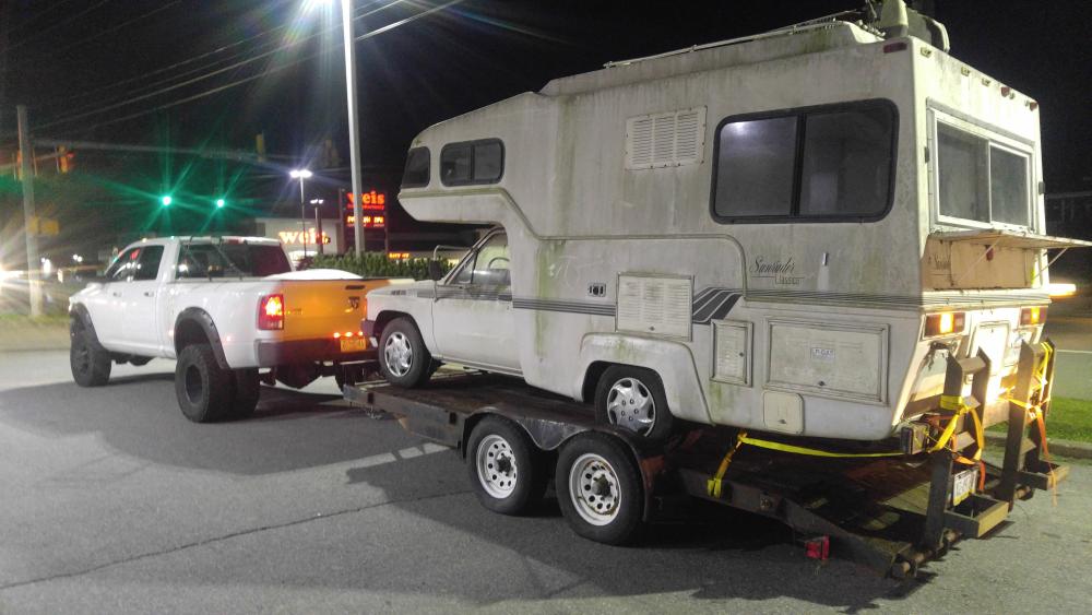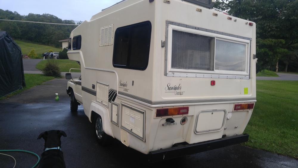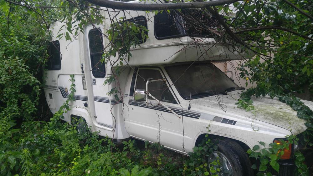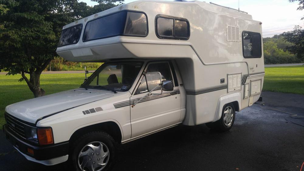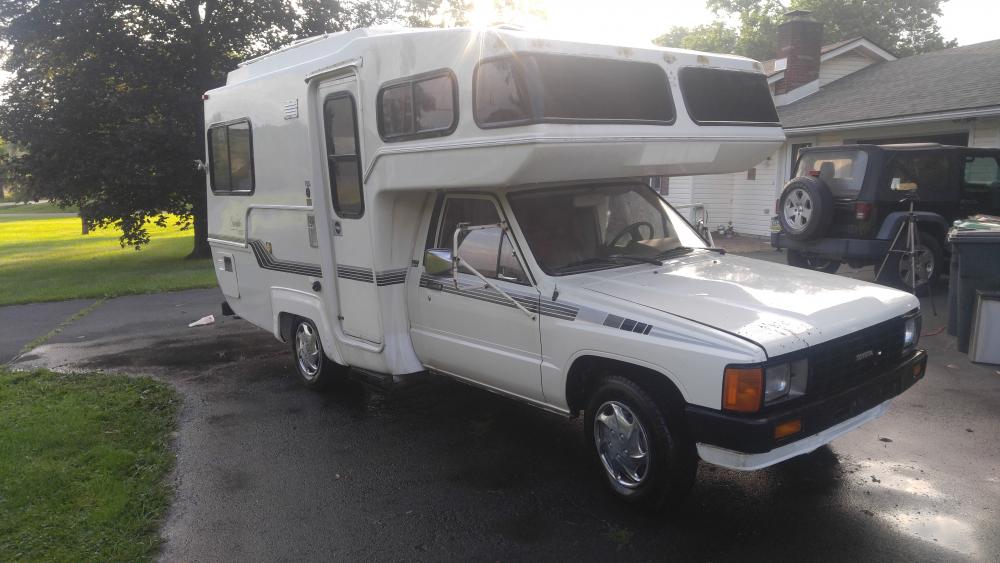 Hello! My name is Jon and I live in Hamilton Square, a small village outside of Stroudsburg, PA approximately 8 miles west of the Delaware Water Gap NJ/PA border. I have been looking for a Toyota based RV for well over 4 years now, I have participated in groups, drooled over craigslist ads, and even helped a friend of mine buy a Dolphin in Florida so he and his girlfriend could travel the country for 2 years. But I never found my rig or one in my price range. Everything I had ever looked at or found, I internally compared to a Sunrader.. It's like my machinist buddies say " no matter what mill you buy, you'll always wish it was a Bridgeport" So I held out and bought a Bridgeport.. Well, one day Karma stepped in and somehow provided to me.... This is my 85 Sunrader. I like to say that I rescued it from a the clutches of nature. This Shorty used to belong to an older gentleman who has since passed. Sadly, his house and and associated property went up for tax sale in 2012. But since the house was is such disrepair it sat and sat and sat...until a friend of mine picked it up for something ridiculous like $10k. During a casual conversation about Toyota based motorhomes my friend mentioned he thought he had one in the driveway of a property he bought. It was late but he asked if I wanted to check it out.. I sort of reluctantly said yes. I was already assuming it would be a rotten and rusty heap of garbage and that I'd be doing nothing more than helping him dispose of it somehow. I followed him down several unfamiliar roads for about 15 mins and up one big steep hill that resembled pikes peak. this road eventually opened up into a lovely neighborhood full of well groomed hedges and striped lawns. We travelled down another 1/4 mile and then my friend stopped next to what appeared to be an undeveloped lot. I thought he wanted to relay some directions to me when he hopped out of his truck and started walking toward me in my jeep so I dropped the window and stuck my head out. Then he said " here we are! park there"... It was 9:30 and pretty darn dark out so I popped on my flashlight app in my phone and followed him through the woods.. he was 5 feet in front of me and held up a pine tree branch as we descended down a small bank. thats when I spotted what appeared to be a mid 90's dodge pickup. I started to check it out and then I heard my pal over in the dark say " Here it is. come check it out". I turned and took a few steps toward his voice. I then lifted my light and saw the toyota grille and headlights and then confirmed to him that yes, it is a Toyota. I then lifted my light and once my eyes focused what I gazed upon were two, glorious, magical, wrap around windows.. It only took a second and then my adrenaline started surging! I couldn't believe it! I was in the presence of an actual Sunrader.. something I always pined over but gave up on many moons ago.. I started getting whimpery and acting giddy.. I then stepped to the side and realized that it was a shorty!! I couldn't barely contain myself. My friend couldn't understand my excitement. I kept saying things like "Unicorn" and "Hens Teeth" and other words describing rare things. That's when with his bewildered face on he asked me "You like this kind of thing?" I quickly exploded with a rambunctious unbridled "YES!!". What I saw wasn't pretty, but I knew it could be and will be one day.. A few mins passed and He still didn't understand my fascination but without a missed beat he said.. " heh', shit.. you can have it.."... That's when I lost my mind and I may have even pee'd a little... That moment on began the planning of the reclamation of the Sunrader from the clutches of nature. I returned the next day with some yard tools and a mission.... The first order of business was to figure out where the heck it was?! So I began the itchy and tedious process of bushwhacking my way into the property. . It was hidden behind this poor neglected Ram.. but that thing had to get lost before I could extract this gem from the driveway. with all of the trees cut I still had to wait for the Dodge to leave so I did what anyone impatient would do.. try to start the rig! I installed a new battery and after a bunch of squirting gasoline into a vacuum hose the 22RE came to life and kept running on it's own! 7+year old fuel still burning nice! Cycled the transmission and it went forward and reverse WAHOO! A few days went by and I got the call that the Dodge was being picked up that evening so I planned on the next day to be rescue day. After work I rushed over, turned the key and moved the rig out of it's sleeping area. the sound of vines ripping and tearing was something else. this rig was becoming part of the scenery. I pulled it out and onto the other driveway area to take a look at the sides I couldn't really see before now and boy was it filthy. The rig was clearly converted to makeshift hot dog cart and unfortunately for me the ladder was cut off and the rear window was removed in order to hack in this abomination of a window as well as a crappy service counter. The installer of this mess clearly had no respect for the rig . A few mins later We loaded her up and headed home..( had to stop for air in the trailer tires) The next day I figured the only way to get my wife to be ok with the Sunrader was to take some of the eyesore factor away from it.. a quick localized cleaning revealed that the years of scum and scuz had protected the gelcoat quite well. So I set forth and fired up the pressure washer and wouldn't you know it.. The rig isn't all that bad looking after all. Sure there markers are all missing and there are lots of little holes and damages caused by the previous owner but overall it's not in bad shape. While the exterior is not too shabby, the interior is an entirely different story as It was abused, neglected, and home to various rodents and spiders for so many years. Part of the dinette will need to be rebuilt and the cabinets need several missi