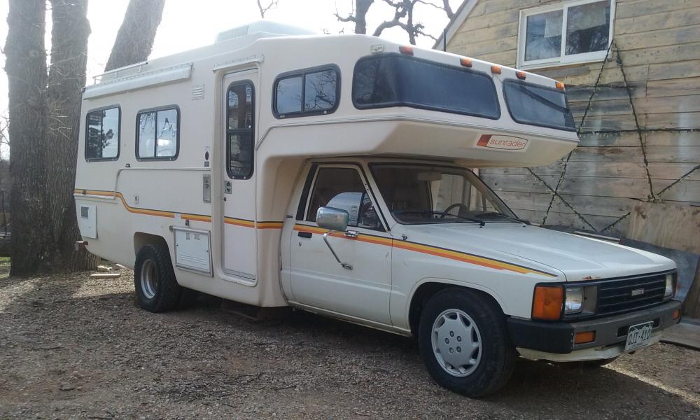 Greeting! LOVE this forum and have been lurking for awhile. My name is Shane and my family and I live in the Black Hills in South Dakota. My wife and I have been weighing whether we wanted a turn key outfit or a project and after 3 years of looking at every Toyota Motorhome craigslist post we could find (rarely seeing a Sunrader), we decided on a PROJECT. This is a 1984 21' Sunrader. 84,000 on the 22R, 4 speed manual. It does have the 6 lug swap out, and it runs well. We drove it home for $2500. That's about the end of the 'pros'. Cons are the leaky roof openings (a/c and vent). One cab-over window is shot. The rest of the windows seem to be holding a good seal. There is some damaged fiberglass between the 2 cab-over windows and near the rear drivers side tire. The roof has a sag where the a/c unit sits. The po also removed the passenger side cabinetry. I have paperwork from less than 2 years ago that show a previous owner had a new alternator, battery isolater and battery installed. None the less, no power to the coach. (Although the marker/ running lights work! I was surprised!) Not sure if any of the appliances/ systems work. The water holding tank, water heater, water pump and grey water tank are all still there. The original furnace is still there, but to the best of the po's knowledge, non-functional. It has the original stove/ oven, but a leaky propane line that I need to repair before I can test. The fridge is electric and not original. The previous owner never used any of the systems. Just the bed. Have only had it for a week and all we've done is clean it up a bit inside and out. The next stop will be our Toyota mechanic's shop to make sure all the fluids are changed, check all the hoses and rubber and whatever else he recommends, and then we'll get started on digging into it! I've read a lot on this forum and I am really grateful for such a killer resource and all the knowledge and wisdom shared here, so THANKS!
